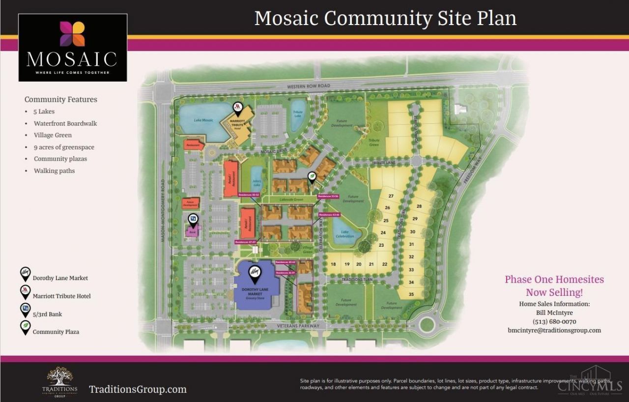 New spacious and modern townhomes from Traditions Group in Mosaic, Mason's new walkable community anchored by Iconic Dorothy Lane Market! The Greenbrier 3 BR + study / 2.5 bath plan offers 1,950 sq. ft. of open first floor living space with additional large, 21'x16' 3rd bedroom on second floor. Enjoy 2 spacious covered courtyards, 10' first floor ceilings, gourmet kitchen with LG SS smart appliances, painted or stained solid maple soft close cabinetry & choice of quartz counter tops. Features also include oversized garage with storage, Andersen windows & irrigation system. Homeowners will enjoy 5 lakes, scenic walking paths, waterfront boardwalk, central village green, community plazas, restaurants & shops. Landscape maintenance & snow pushing included in neighborhood association.
